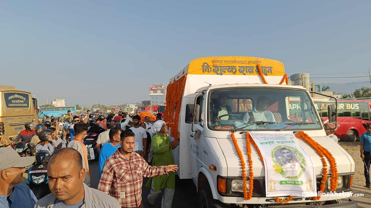 कञ्चनपुर — प्यालेस्टिनी लडाकु समूह हमासद्वारा बन्धक बनाइएका बेला ज्यान गुमाएका कञ्चनपुरका विपिन जोशीको शवयात्रा मंगलबार बिहान हजारौं सर्वसाधारणको सहभागितामा सुरु भएको छ। राष्ट्रिय सम्मानका साथ भीमदत्त नगरपालिकाको भुजेलाघाटस्थित महाकाली नदीमा विपिनको अन्त्येष्टि गर्न तयारी भइरहेको छ।